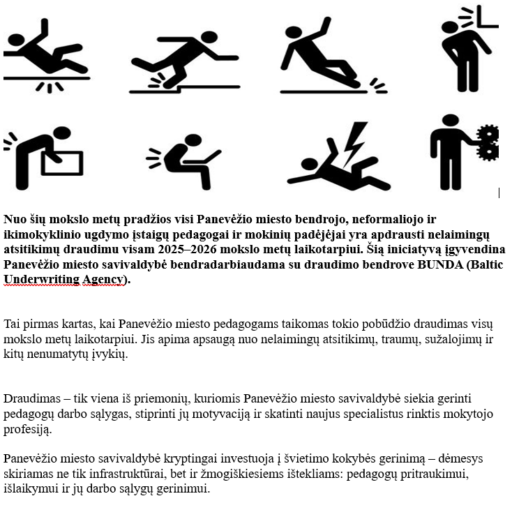 Nuo šių mokslo metų pradžios visi Panevėžio miesto bendrojo, neformaliojo ir ikimokyklinio ugdymo įstaigų pedagogai ir mokinių padėjėjai yra apdrausti nelaimingų atsitikimų draudimu visam 2025–2026 mokslo metų laikotarpiui. Šią iniciatyvą įgyvendina Panevėžio miesto savivaldybė bendradarbiaudama su draudimo bendrove BUNDA (Baltic Underwriting Agency).