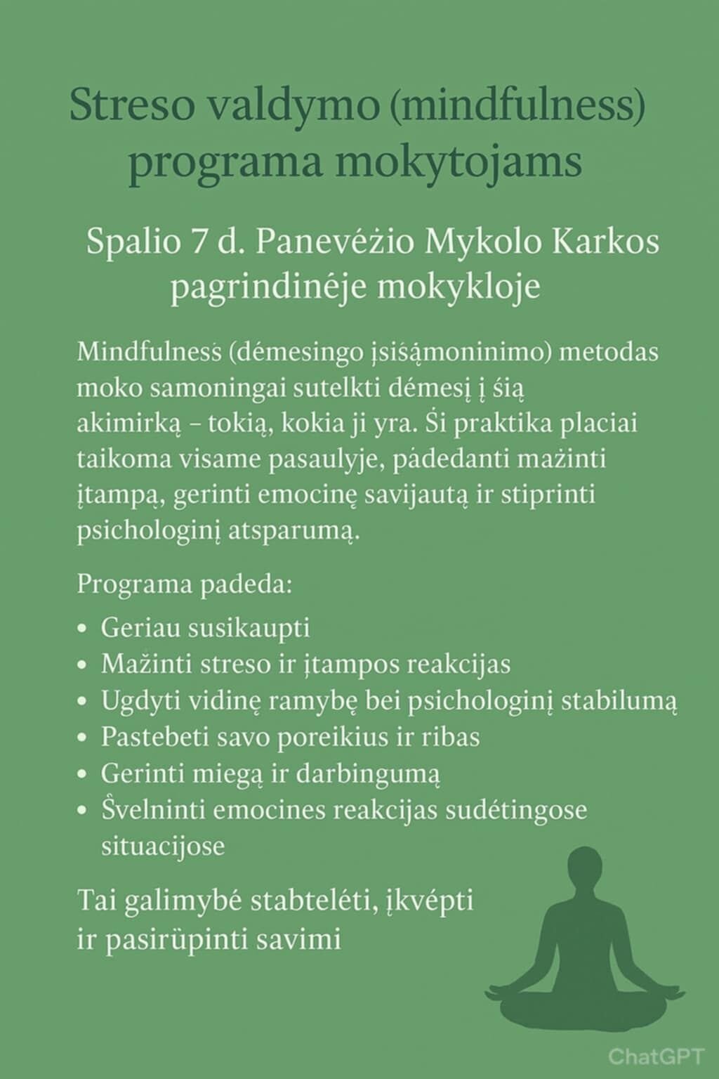 8 savaičių sąmoningumu (mindfulness) grįsto streso valdymo grupė M. Karkos pagrindinėje mokykloje