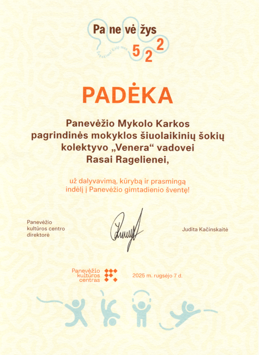 Panevėžio Mykolo Karkos pagrindinės mokyklos bendruomenė bei šiuolaikinių šokių kolektyvo „Venera“ vadovė Rasutė Ragelienė buvo pagerbtos Panevėžio miesto gimtadienio šventėje, už kūrybišką dalyvavimą ir prasmingą indėlį puoselėjant miesto šventę.