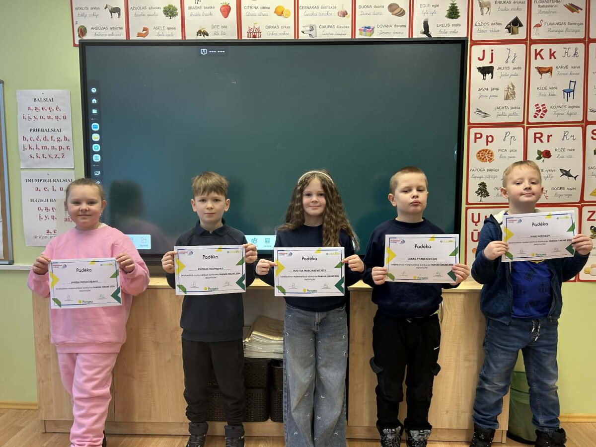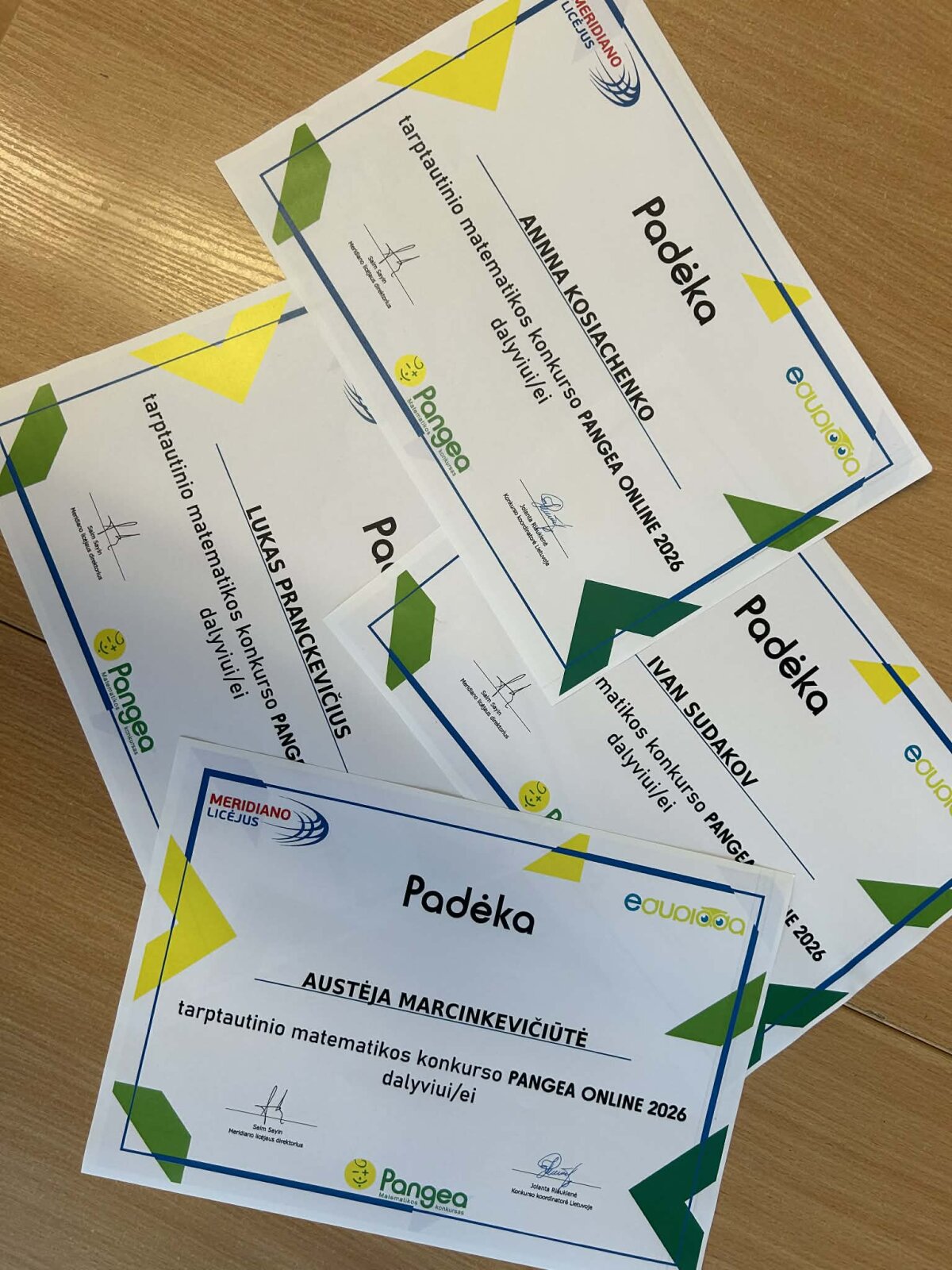 2c klasės mokiniai Austėja, Anna, Lukas, Ivan ir Enrikas išbandė jėgas tarptautiniame matematikos konkurse "Pangea 2026".