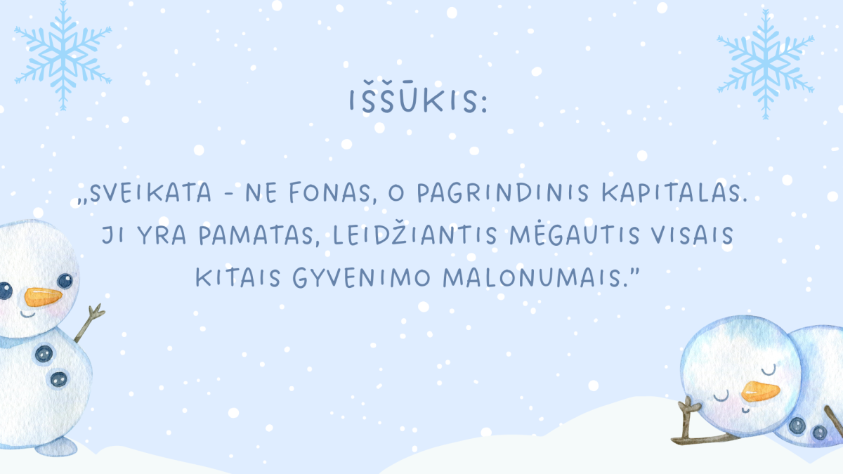 Pavasaris jau įsibėgėja, saulutė vis drąsiau šildo ir gamta bunda po žiemos miego. Bet labai smagu, kad sulaukėme žiemą atliktų darbų įvertinimo. Pagaliau buvo paskelbti LINEŠA projekto ,,Sveikata visus metus" žiemos iššūkio rezultatai. Projekte dalyvavo net 485 komandos ir 27976 dalyviai iš visos Lietuvos.