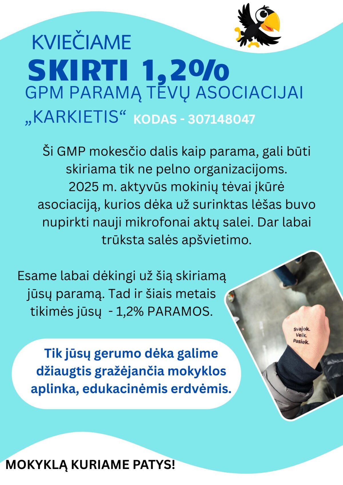 mokyklos stiprybė – žmonės, kurie ja tiki. Kviečiame prisidėti prie veiklų ir iniciatyvų skirdami 1,2 % gyventojų pajamų mokesčio. Tai nieko nekainuoja, tačiau mums reiškia labai daug: daugiau galimybių vaikams, daugiau kūrybiškų projektų, daugiau edukacinių aplinkų.