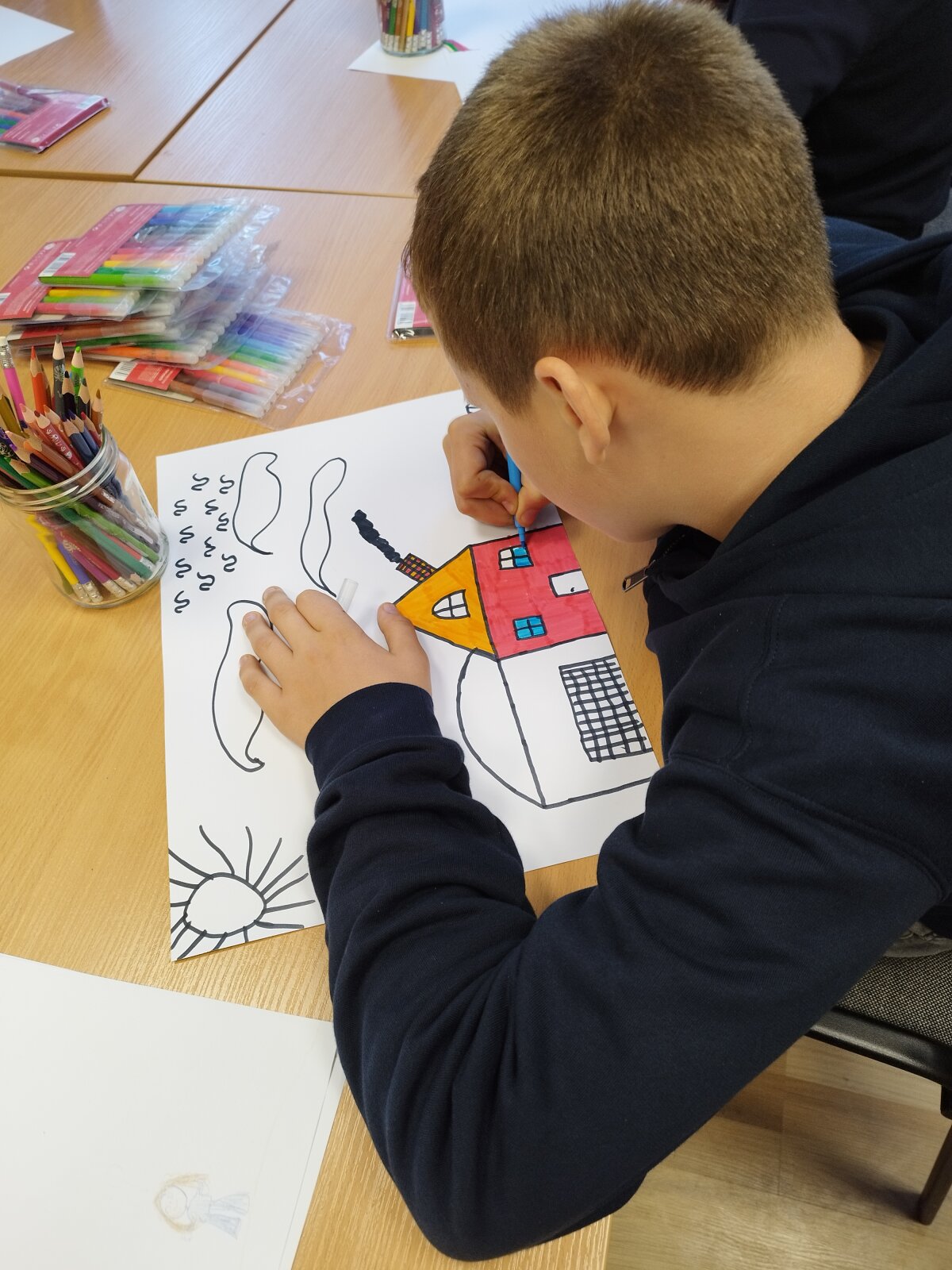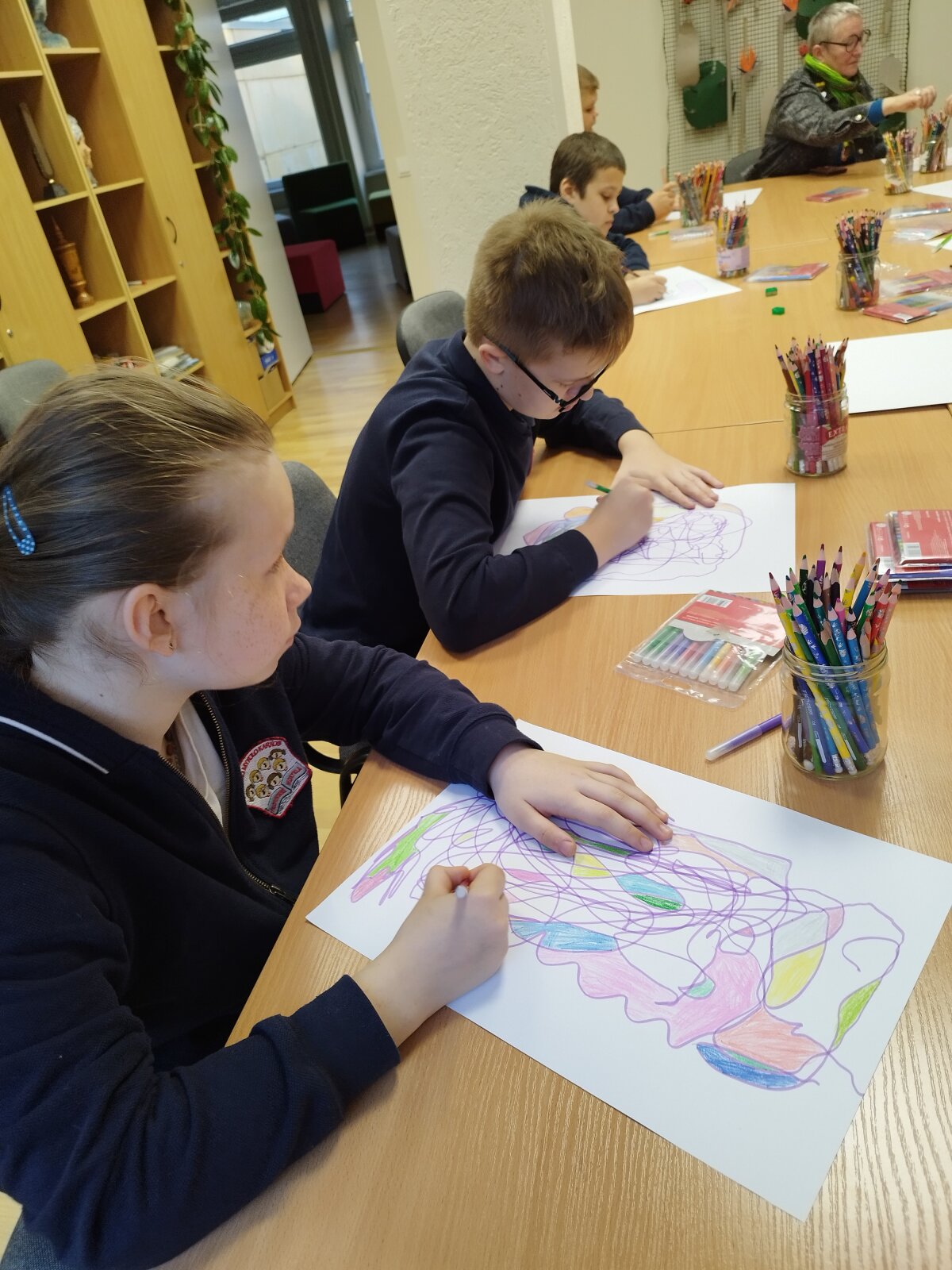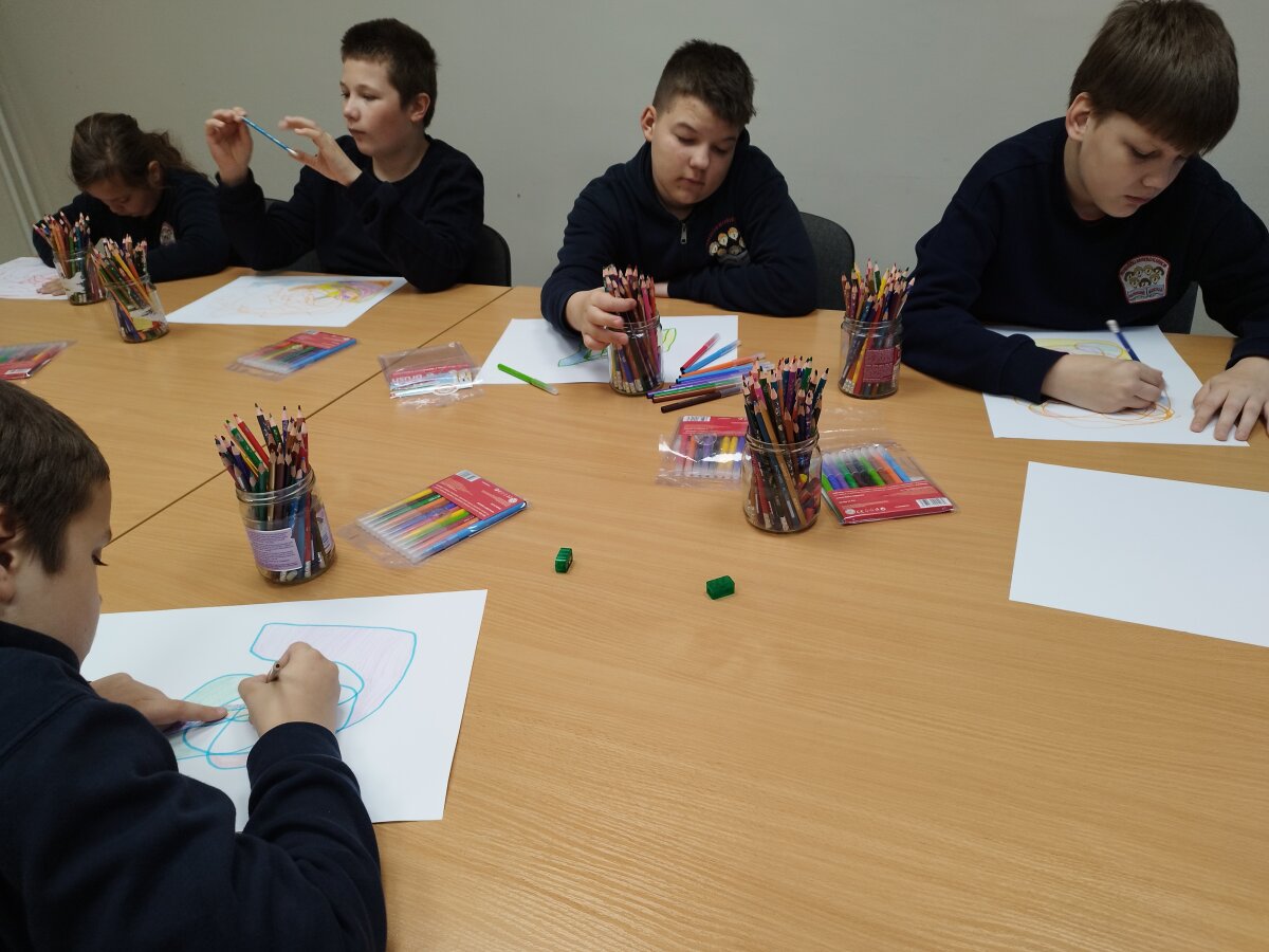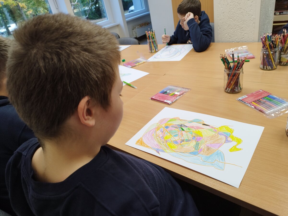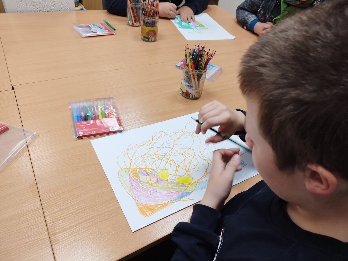 Vis dar sunku piešiniu išreikšti tai, kas slypi viduje, sukaupti dėmesį, kantriai išklausyti klasės draugus, formuluoti savo mintis ir įvardinti įvairias emocijas. Todėl ir mokomės piešdami atsipalaiduoti, aptardami darbus - išsikalbėti, klausydami kitų - būti kantrūs.