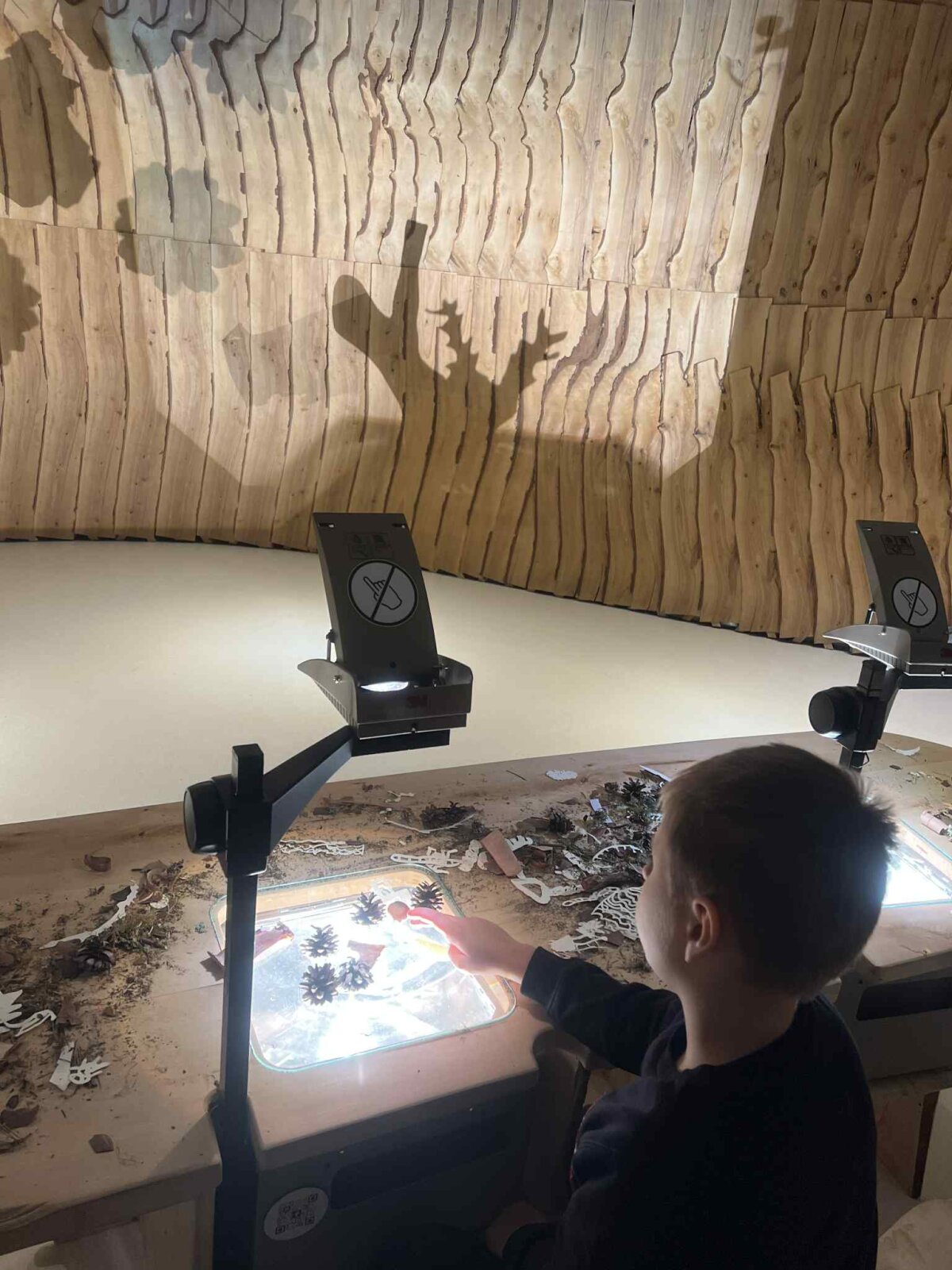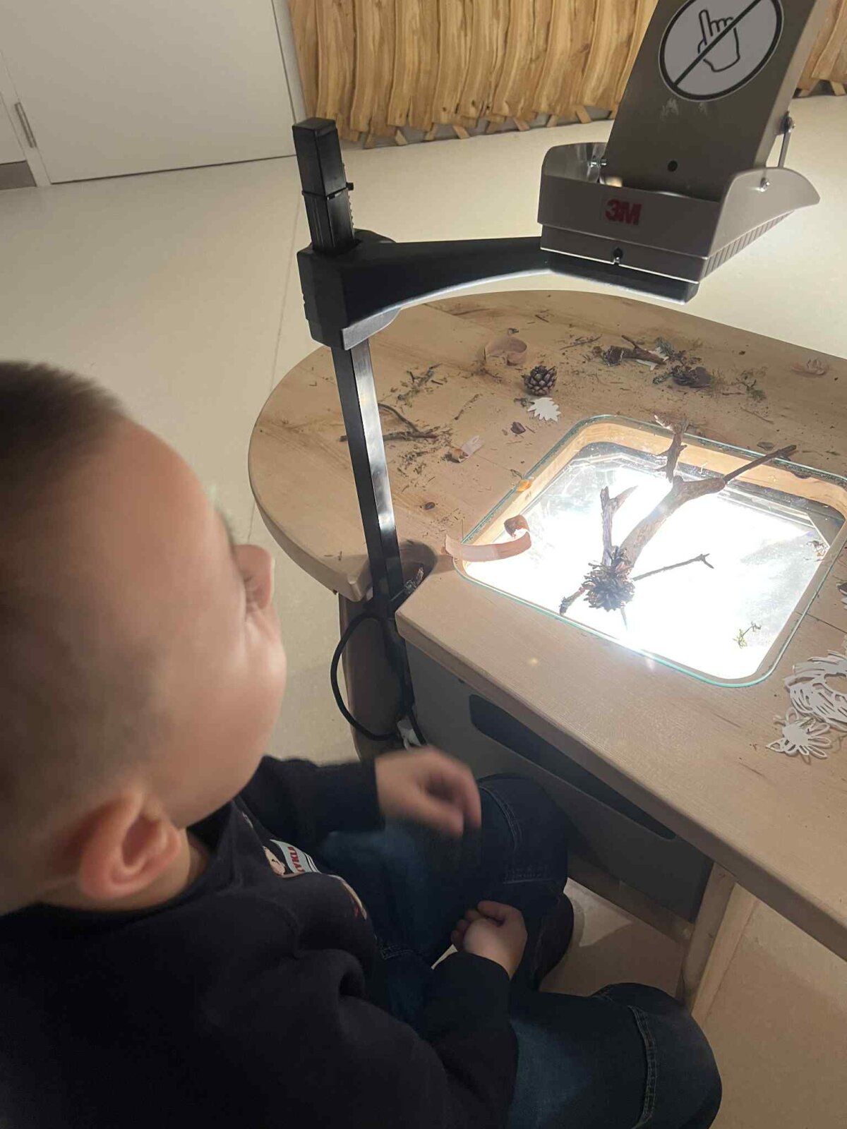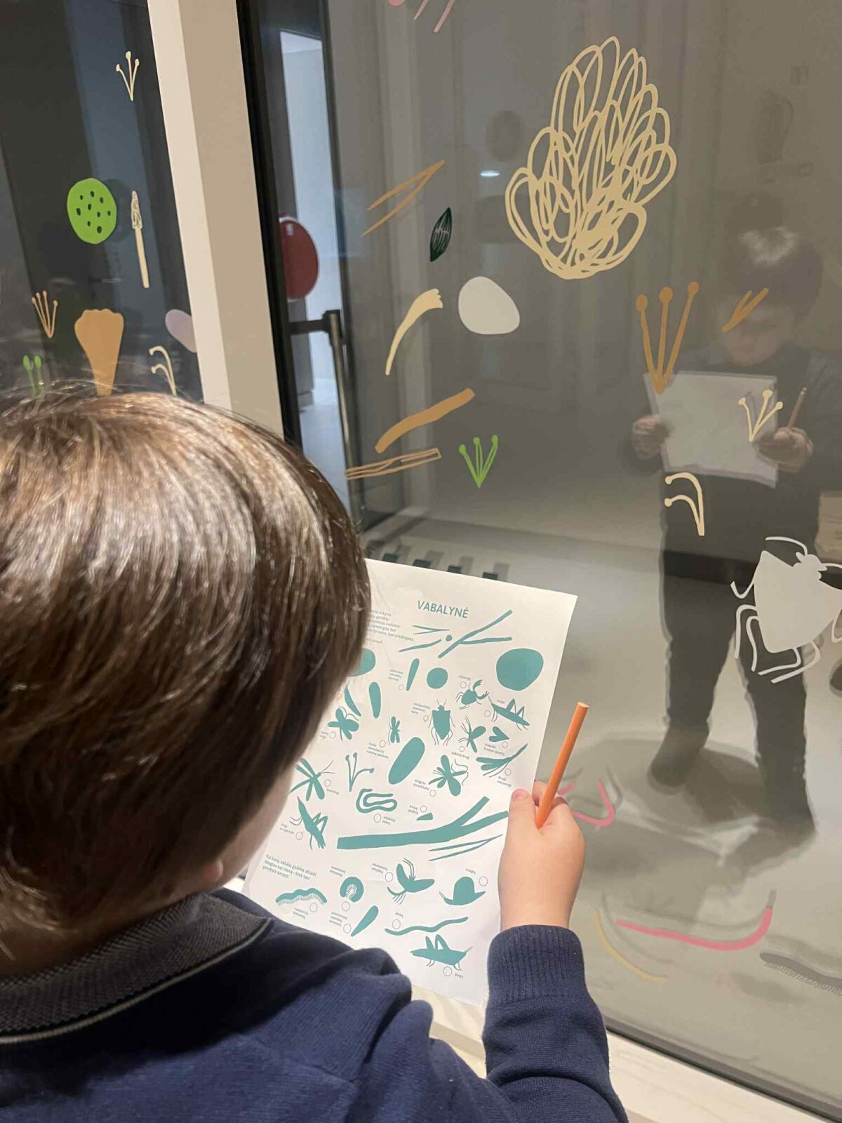 Užsiėmimuose vaikai susipažino ir išbandė miško šešėlių žaismą- projektoriumi padidino lapų, samanų, šakelių, kerpių, pušų spyglių ir kitų miško elementų siluetų piešinius. ,,Vabalyne“ lietė, jungė ant langų esančius piešinius, ieškojo bei tyrinėjo, analizavo lipdukus ant stiklo, piešė pasirinktas emocijas.