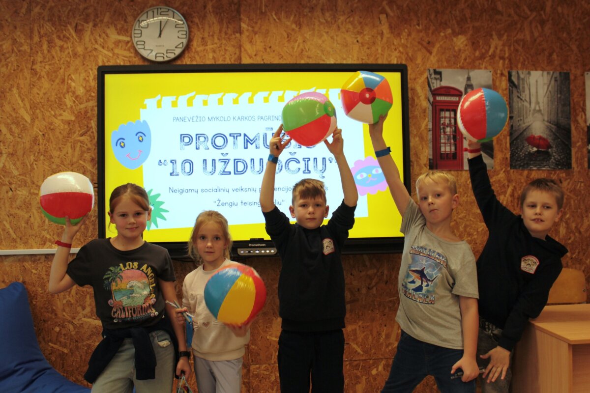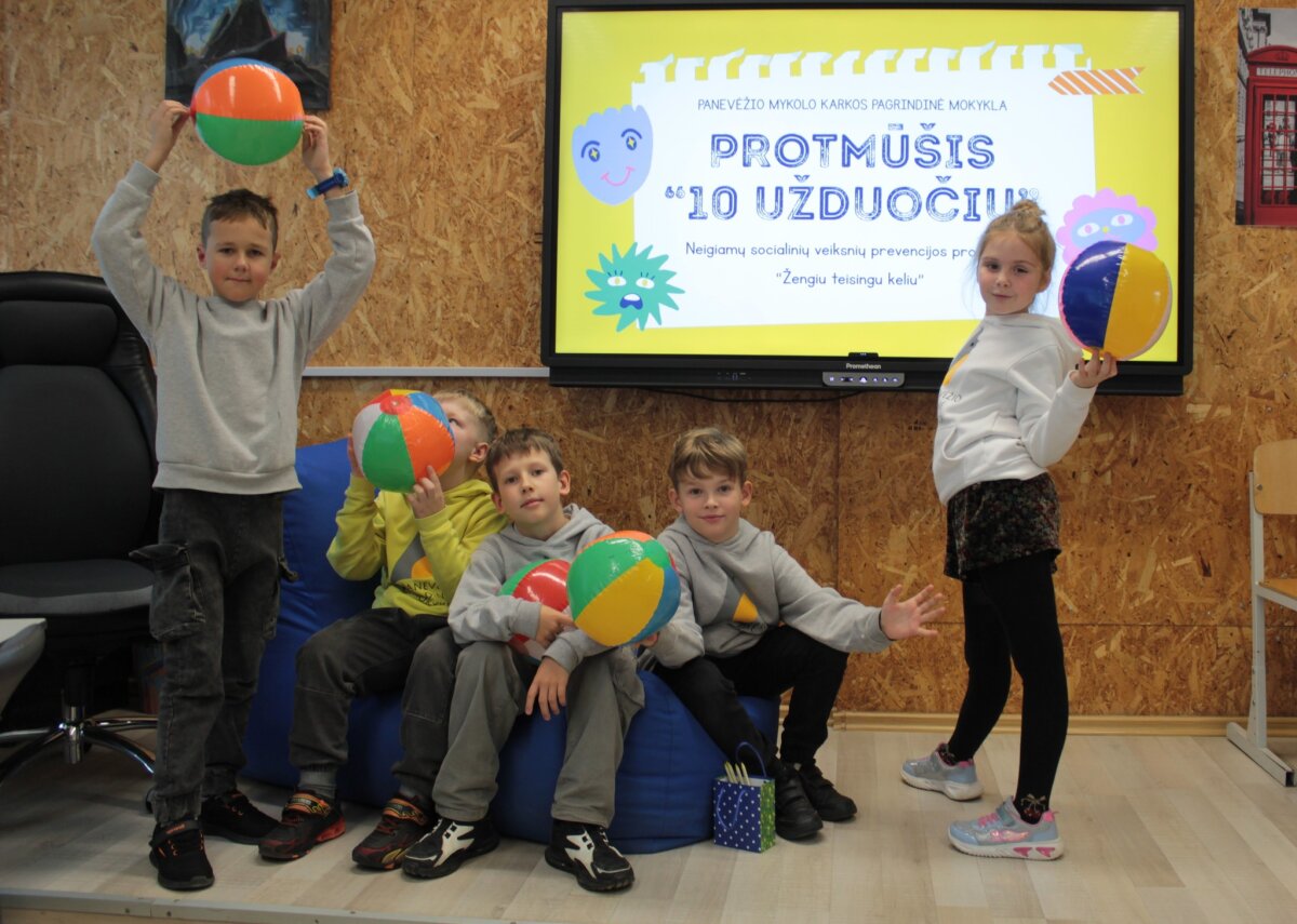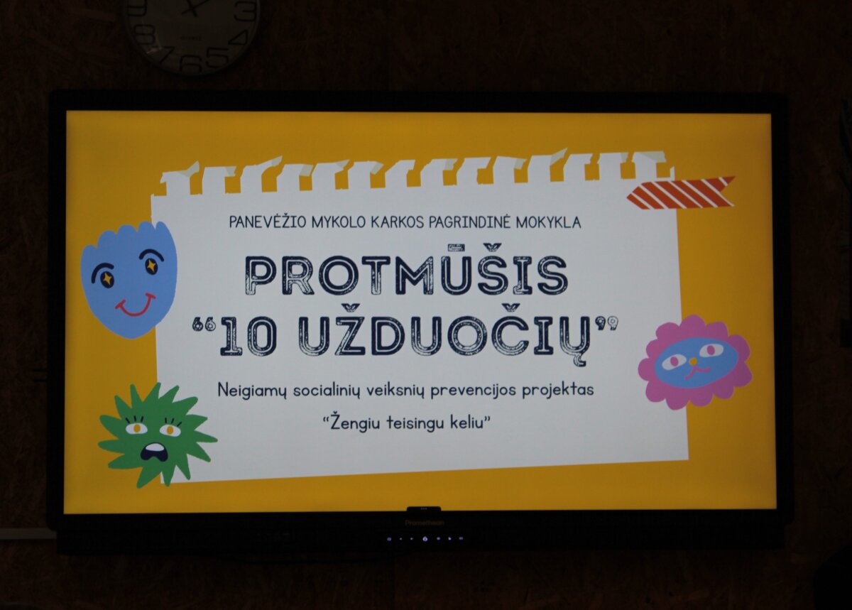 Spalio mėnesį mūsų mokykloje vyko jau tradiciniu tapęs neigiamų socialinių veiksnių prevencijos projekto „Žengiu teisingu keliu“ renginys – protmūšis „10 užduočių“, kuriame savo jėgas išbandė antrų klasių mokiniai. Septintos klasės mokinės Emilija, Viltė ir Emilija pasveikino visus susirinkusius, o nuotaikai pakelti bendrai sudainuoti dainelę "Du gaideliai" pakvietė mokytojas Jonas Kaziliūnas.