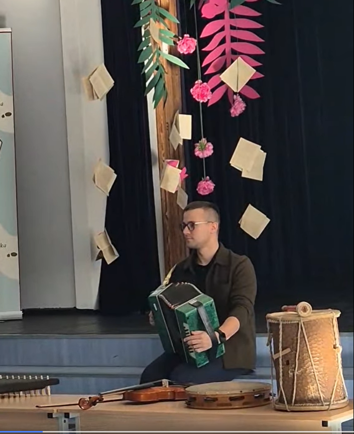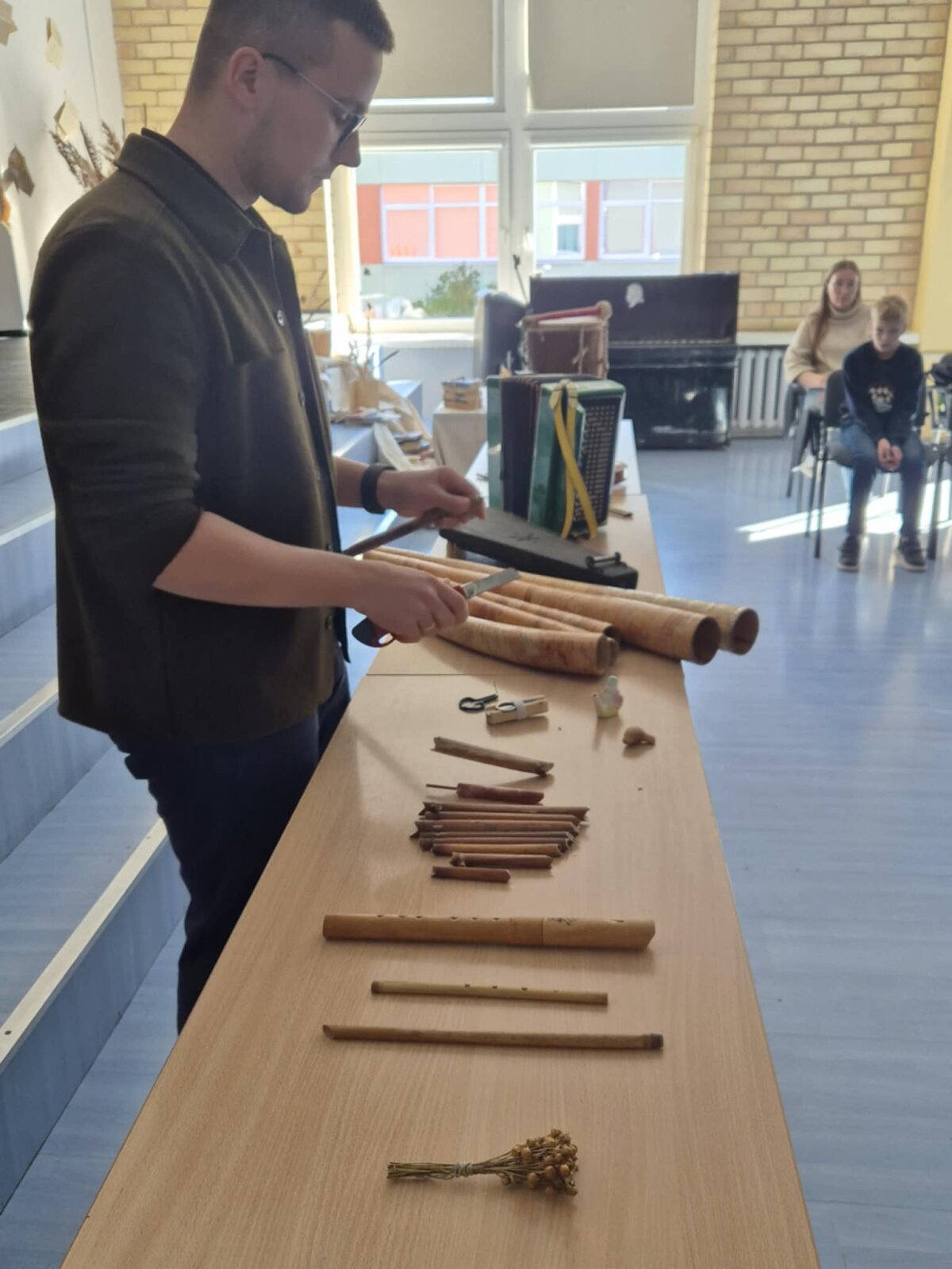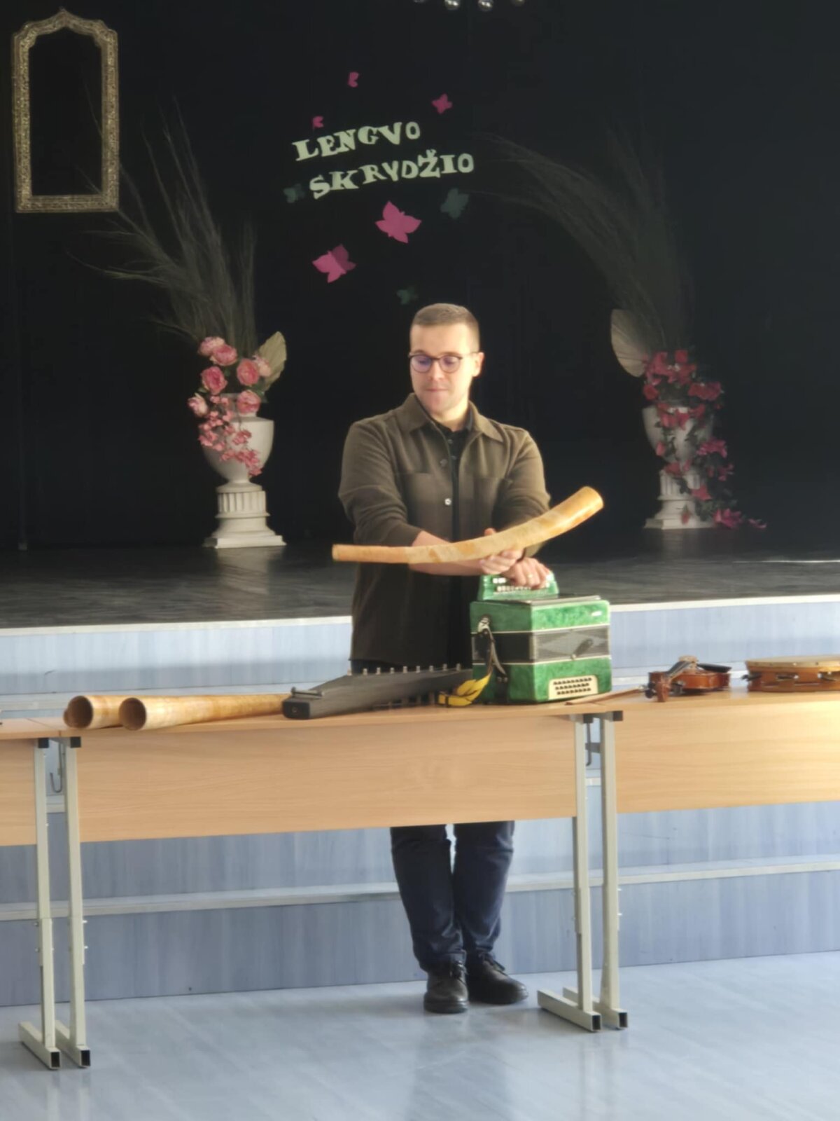 Dar įdomiau buvo tada, kai Lukas Simsonas pristatė įvairius liaudies muzikos instrumentus. Salėje nuaidėjo ragų gausmas, būgnų ritmai, kanklių skambesys, o kai kurie instrumentai net pamėgdžiojo paukščių čiulbėjimą! Mokiniai klausėsi su dideliu susidomėjimu, kai etnomuzikologas rodė, kaip senieji lietuviški garsai gali papasakoti ištisas istorijas be žodžių.