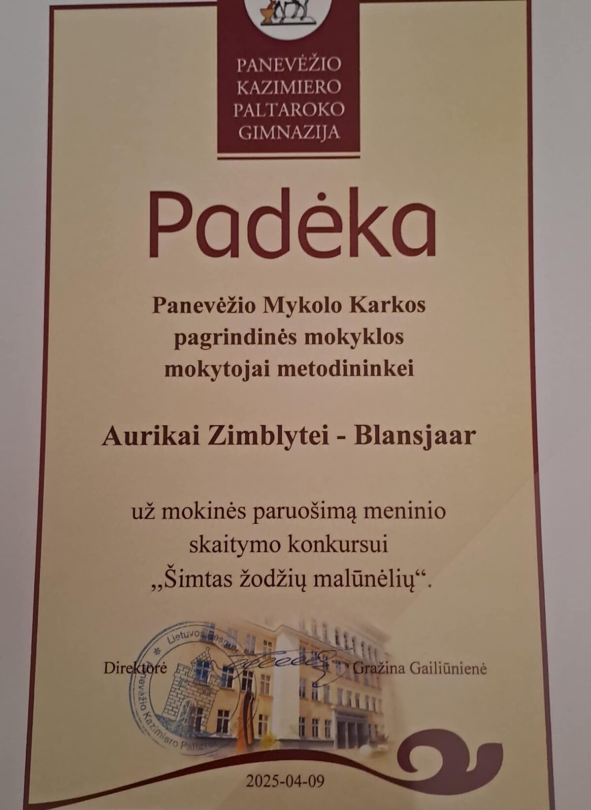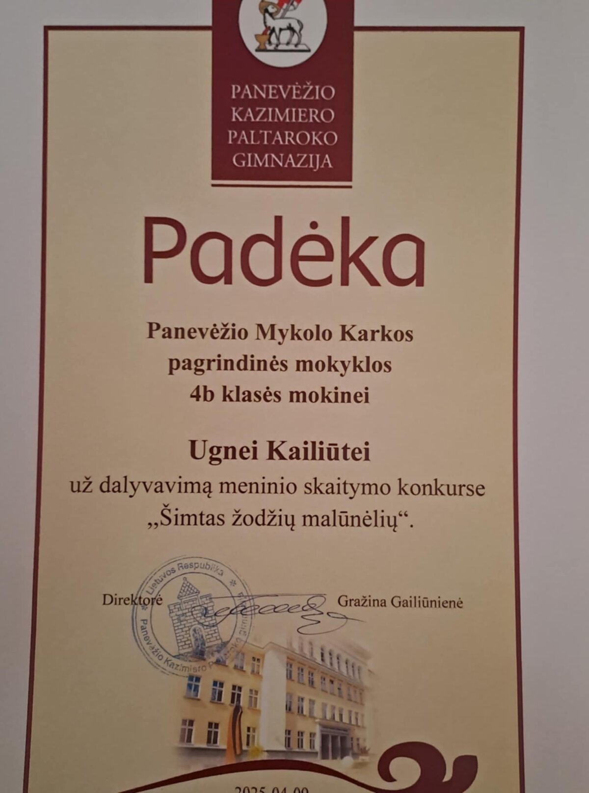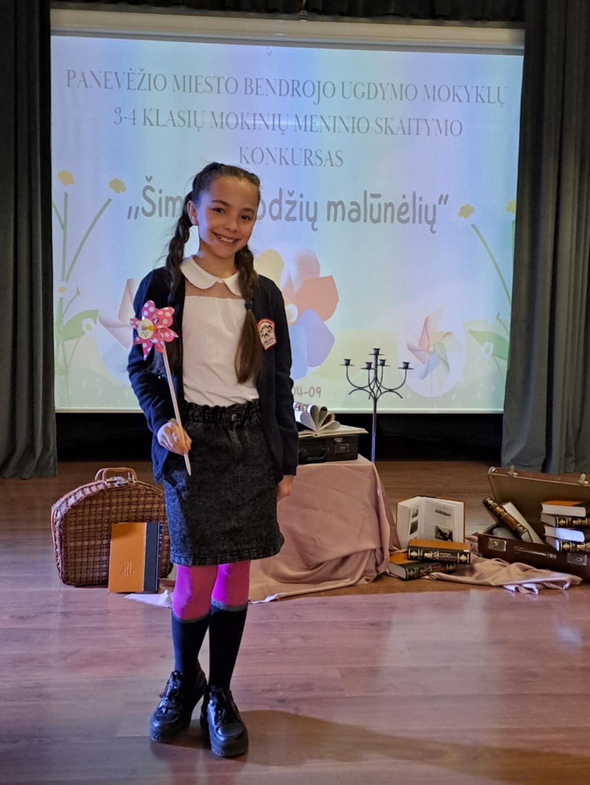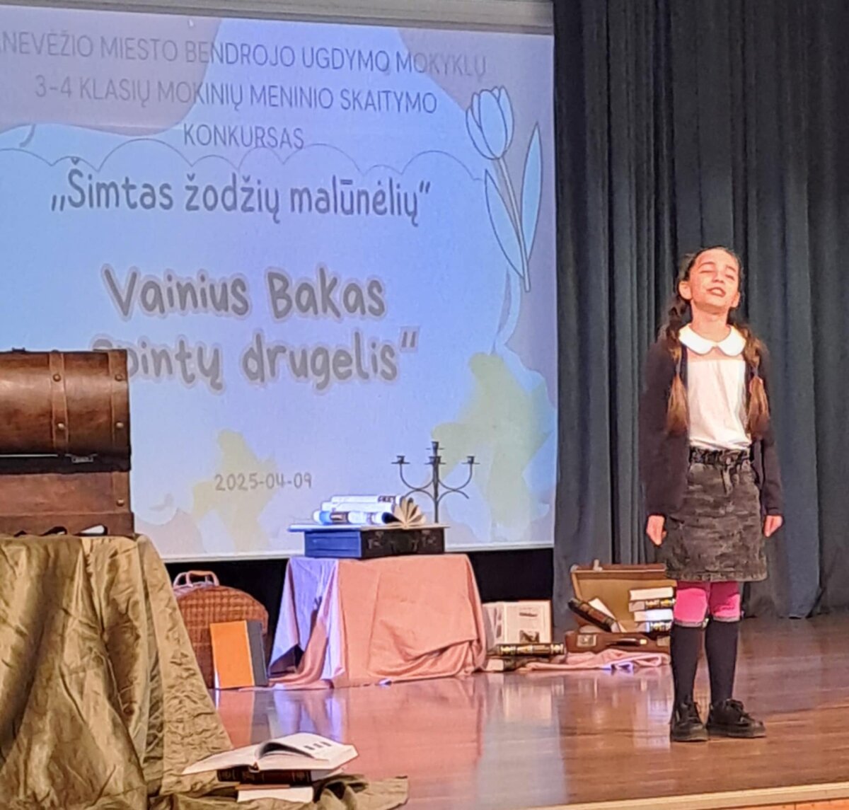 Balandžio 9 dieną 4d klasės mokinė Ugnė Kailiūtė dalyvavo Panevėžio miesto 3-4 klasių mokinių meninio skaitymo konkurse,,Šimtas žodžių malūnėlių", kuris vyko Kazimiero Paltaroko gimnazijoje.Ugnė deklamavo Vainiaus Bako eilėraštį,,Spintų drugelis".Konkurso metu mokinė pagilino kultūrinę bei pilietiškumo kompetencijas.