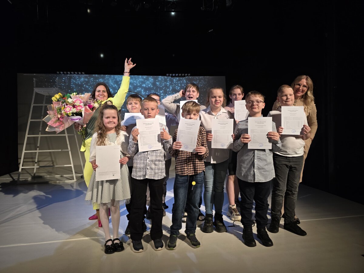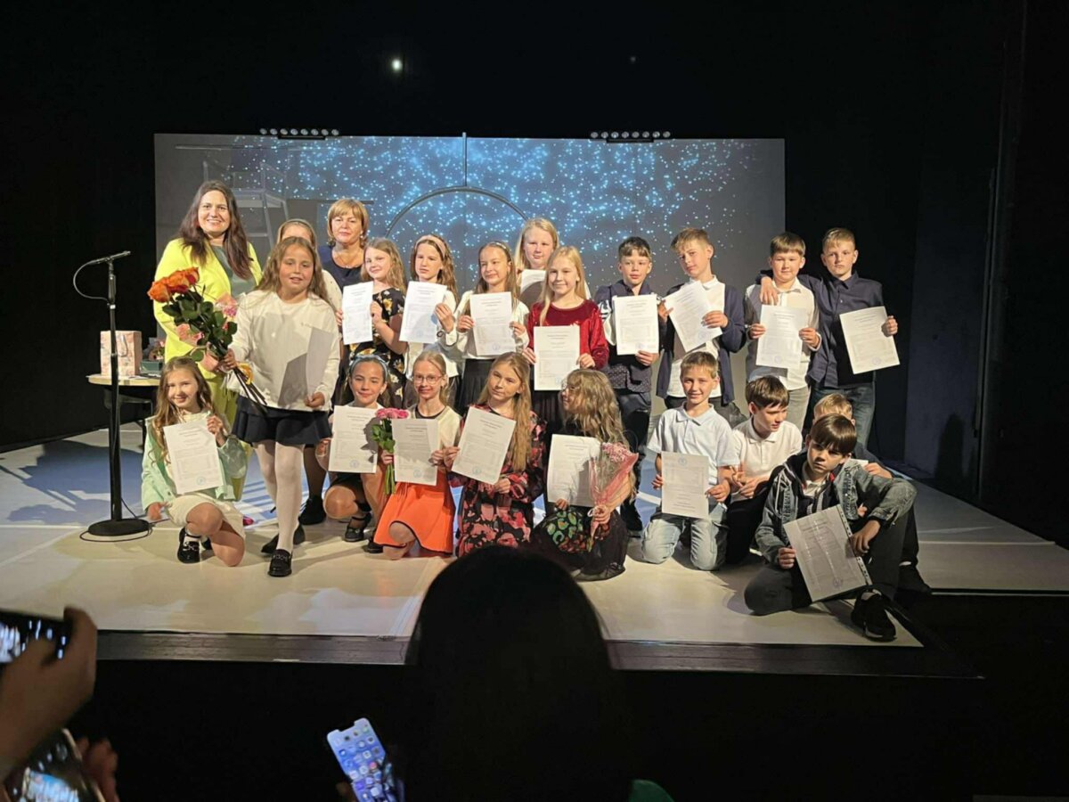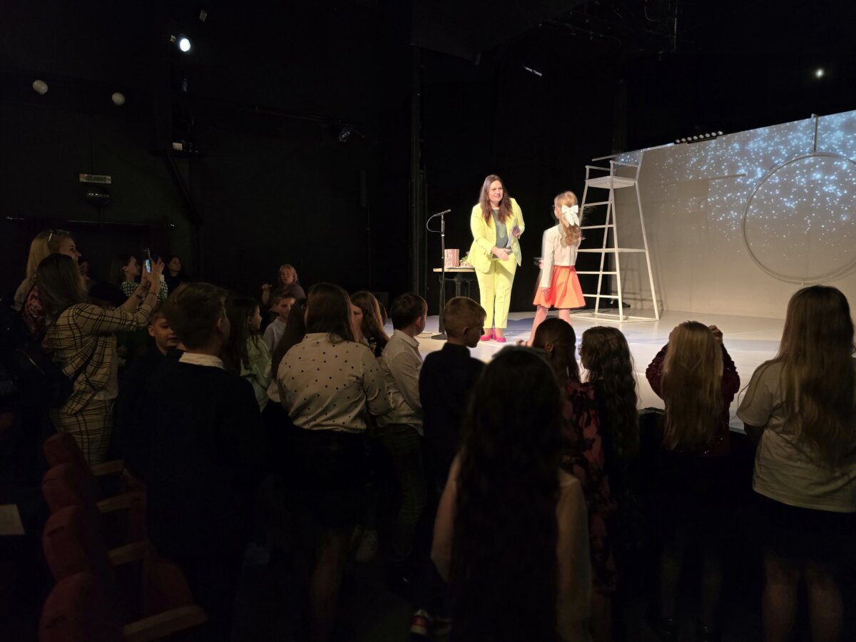 Po pamokos mokiniai kartu su mokytojomis išvyko į teatrą „Menas“, kur visi kartu žiūrėjo nuotaikingą spektaklį. O po jo laukė ypatinga akimirka – mokyklos direktorės sveikinimas, kuriuo ji iškilmingai pasveikino visus ketvirtokus su įgytu pradiniu išsilavinimu.