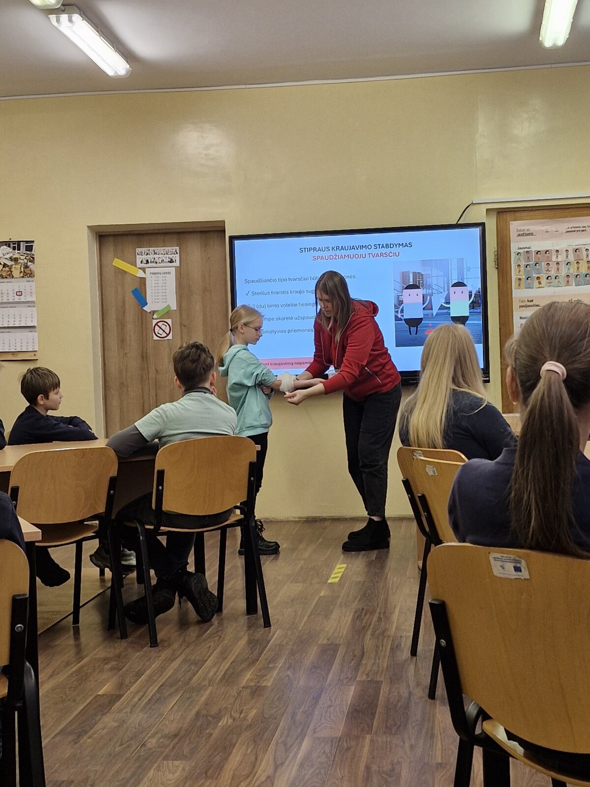 Mokiniai susitiko su Atviros jaunimo erdvės VšĮ Septynios akimirkos darbuotojomis, išgirdo apie savanorystės galimybes, o kartu su Lietuvos Raudonojo Kryžiaus Panevėžio skyriumi mokėsi pirmosios pagalbos pagrindų.