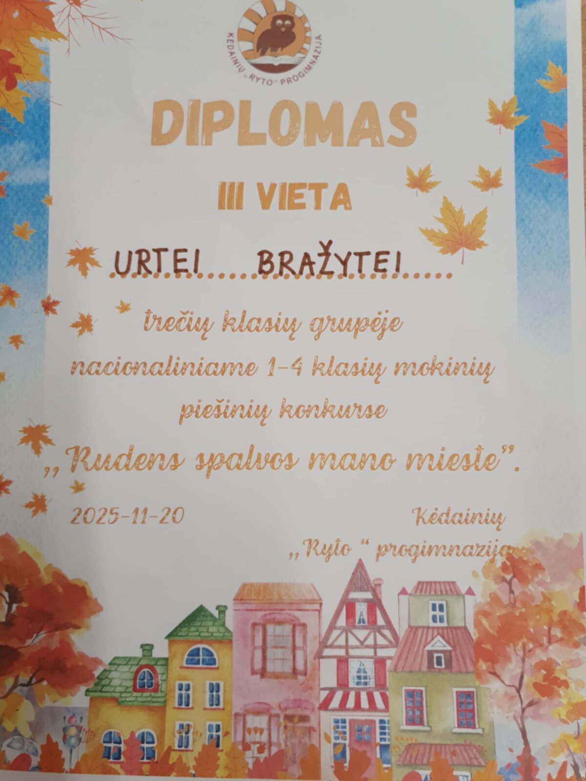 Kėdainių ,,Ryto" progimnazijoje vyko nacionalinis 1 - 4 klasių mokinių piešinių konkursas ,,Rudens spalvos mano mieste, kuriame aktyviai dalyvavo ir mūsų mokyklos trečiokai. Jaunieji kūrėjai pateikė spalvingus, rudens nuotaika alsuojančius darbus, atspindinčius Panevėžio miesto grožį.